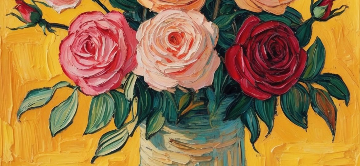 Prompt: A vibrant post-impressionist oil painting, reminiscent of Vincent van Gogh’s style, featuring a bouquet of fifteen roses in a cylindrical vase, set against a warm, sunny yellow background, with thick, heavy brushstrokes and textured layers of paint, bold, expressive rose petals in shades of pink, peach, and crimson, and long, slender stems with delicate thorns, the vase itself adorned with subtle, earthy tones, placed on a worn, wooden table or shelf, with a few stray leaves and petals scattered around the base, capturing the essence of a sunny summer day, with a sense of energetic movement and bold, expressive colors.