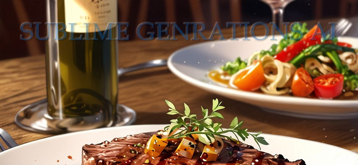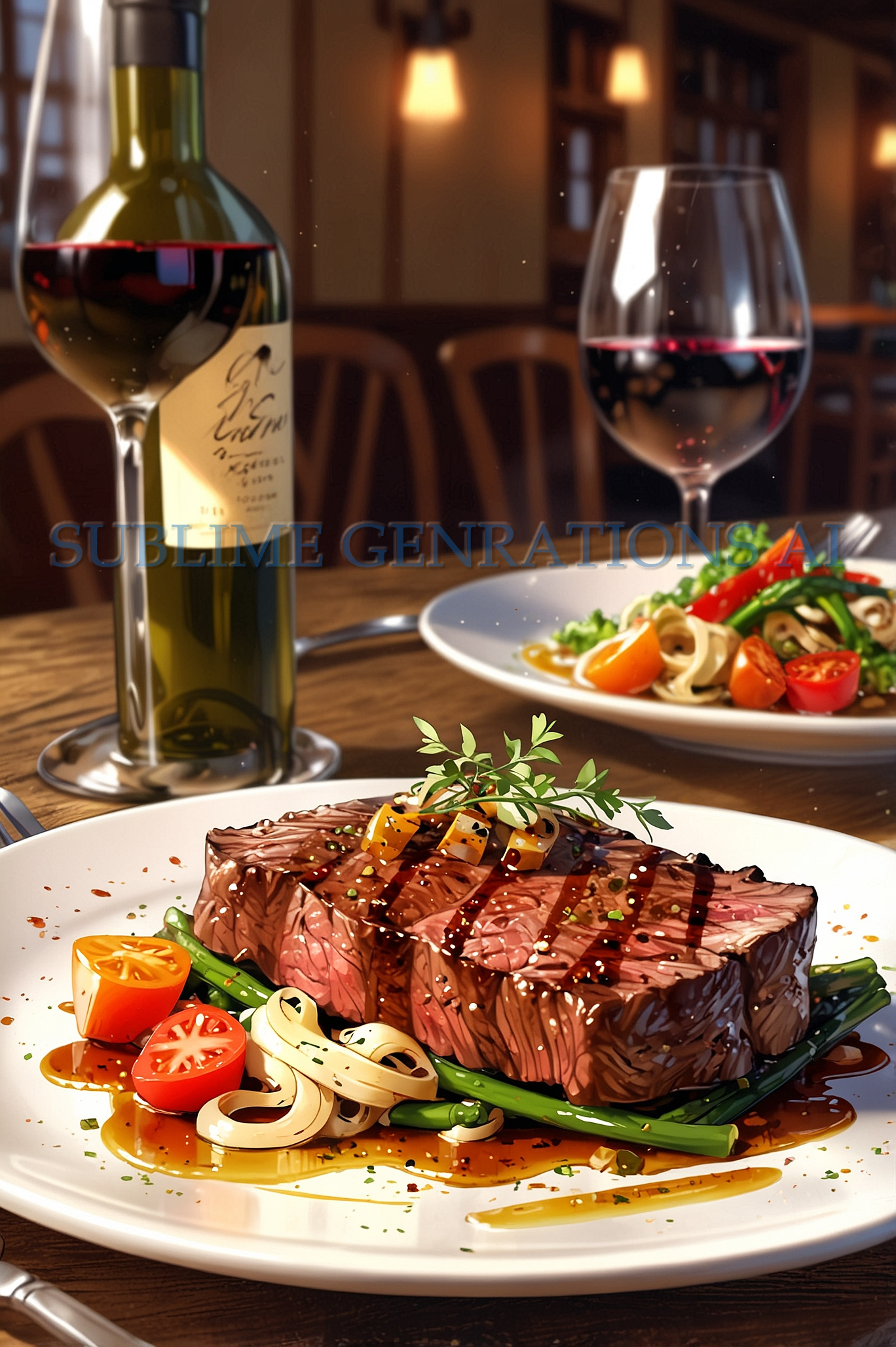 Prompt: A vibrant close-up of a plate of tenderloin steak, served with colorful vegetables, and cooked noodles in olive oil garlic sauce. The food is served on a white plate with a glass of cabernet red wine. The setting is a rustic wooden table, with warm lighting that highlights the rich colors and textures, creating an appetizing and cozy atmosphere.
