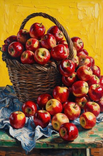 A humble basket of apples is transformed into a vibrant work of art inspired by the Post-Impressionist masters. The apples, with their bold, saturated hues of red, green, and yellow, stand out against the soft, textured brushstrokes that give the scene a lively, painterly feel.