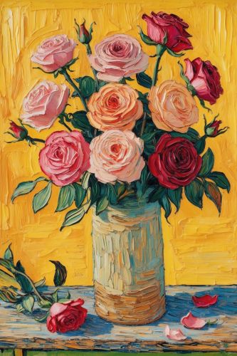 The image brings the beauty of a classic bouquet of roses to life through the lens of Post-Impressionist artistry. The roses, with their vibrant shades of red, pink, and soft whites, are depicted with bold, expressive brushstrokes, giving the petals a textured, almost swirling appearance.